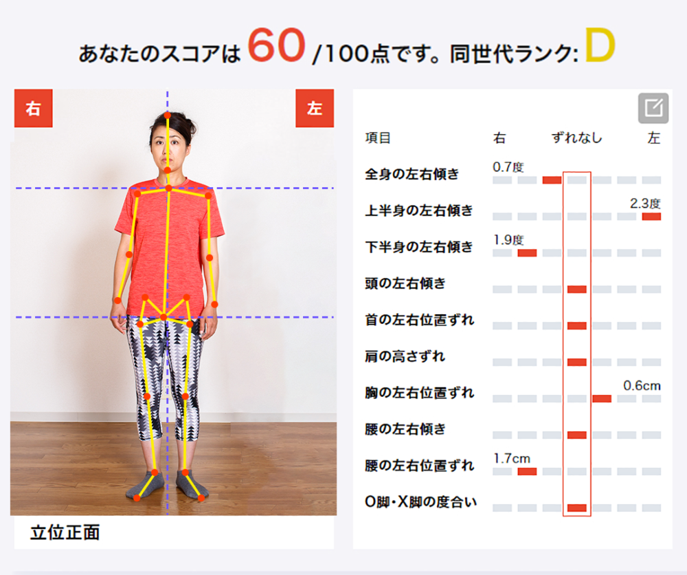 最新の画像解析技術を用いたこのシステムは、お写真を数枚撮影するだけで、現在のお身体の歪みや、筋肉の固くなりやすい箇所、脂肪の付きやすい箇所を可視化します。