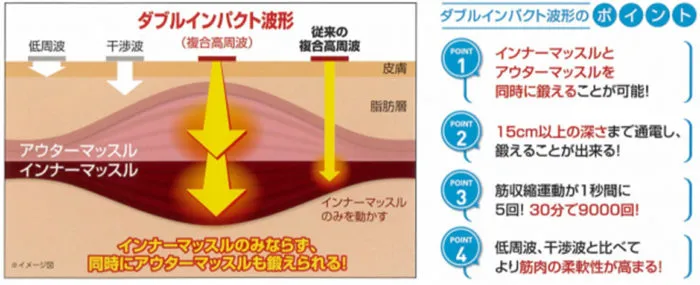楽トレの複合高周波は、低周波の何倍もの深部に通電しアウターマッスルのほかインナーマッスルまで鍛えることが可能です。