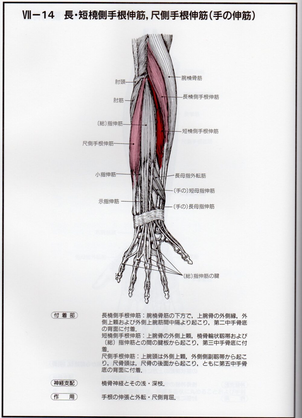 - 前腕の親指側の筋肉(母指側の伸筋群)に強い緊張